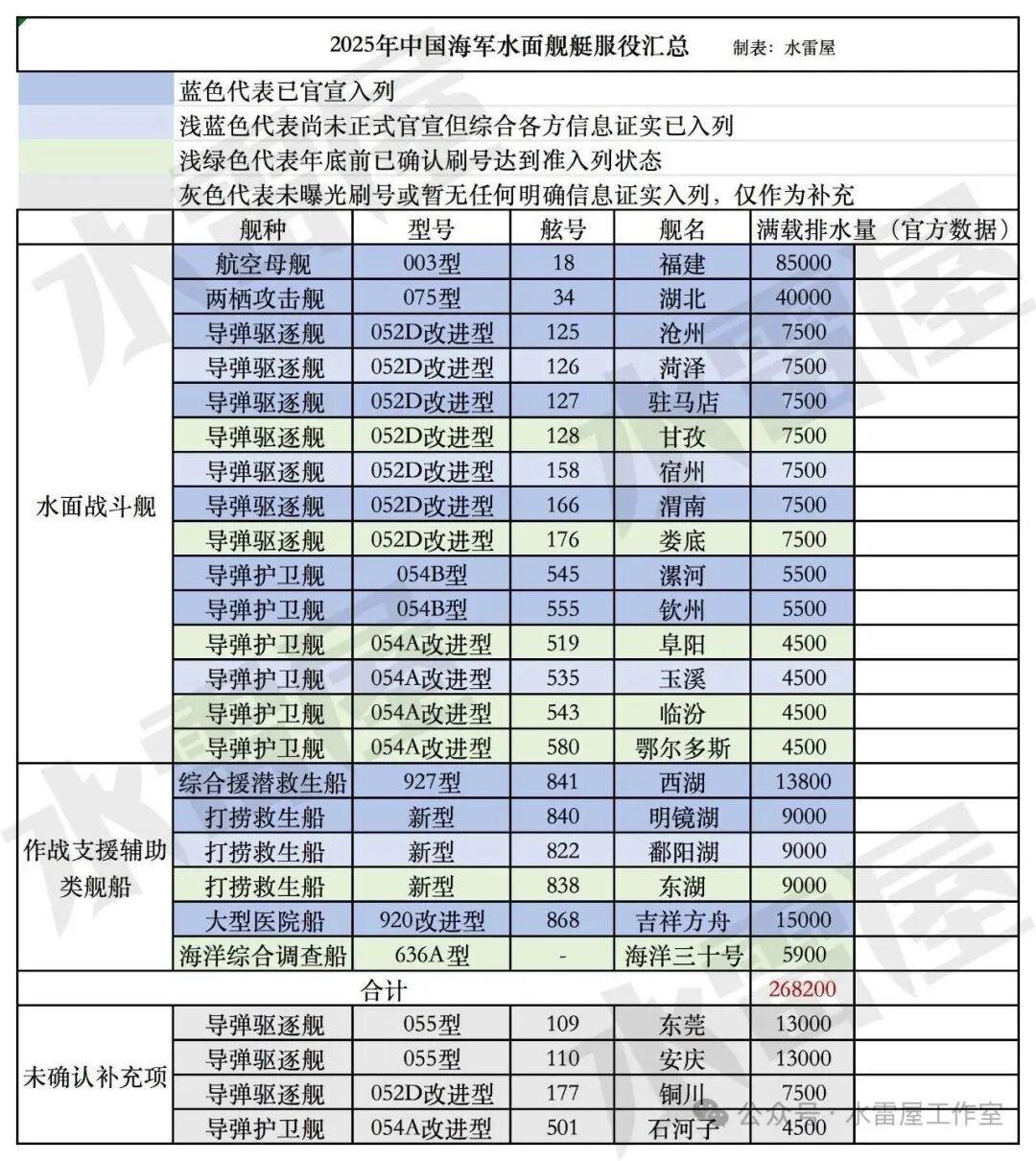 不过,根据国内大佬“水雷屋”等人的统计,2025年我海军新服役了1艘航母“福建舰”、7艘新批次的052D驱逐舰在内的约20多艘水面舰艇,实际总吨位其实超过了26万吨。而且这26万吨还未包含十分神秘的水下潜艇,若是再加上潜艇,那这一数据可能会超过30万吨。